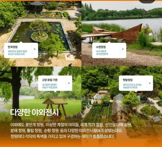 - 특징 : 국내외 25개국 200여 개 기관이 참가하는 대규모 꽃 박람회로, 다양한 원예 작품과 조경 전시가 이루어집니다.